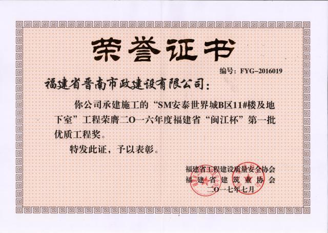 今年7月,福建省住房和城乡建设厅办公室发布《关于公布2016年度福建省“闽江杯”优质工程奖获奖工程名单的通报(第一批)》(闽建质安协〔2017〕20号),由福建省晋南建设集团有限公司担任施工方的SM安泰世界城B区11#楼及地下室、C区62#-67#楼及地下室建筑榜上有名,荣获2016年度福建省“闽江杯”第一批优质工程奖。今年,SM安泰世界城工程其中三个标段还曾获评2016年度“刺桐杯”优质工程奖。